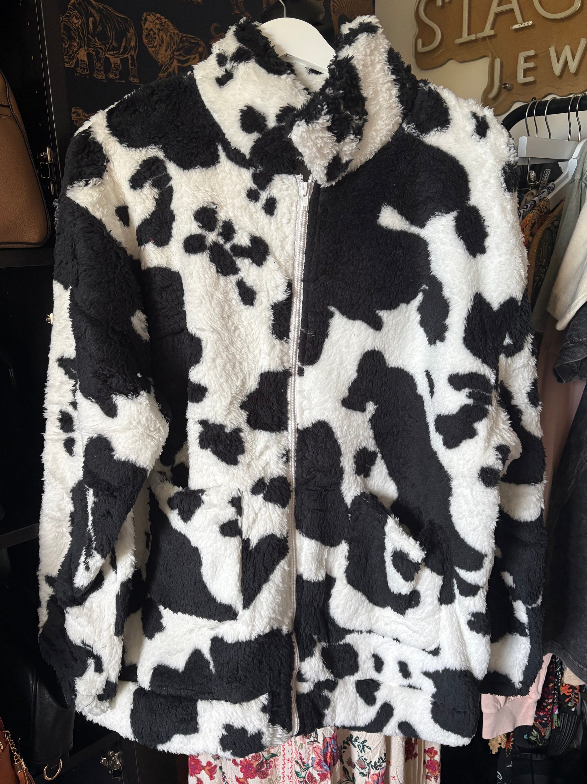 This Cowprint Fleece Jumper features a stunning design, perfect for those who love a country-themed look. ๐พ